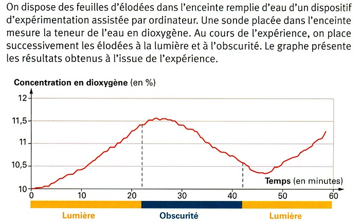 A l’obscurité le pourcentage de dioxygène passe de 20,7% à 20,6%, il diminue. L’élodée consomme du dioxygène. A l’obscurité l’Élodée respire.