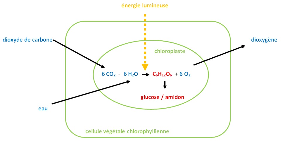 A la lumière et en présence de dioxyde de carbone, une production de matière organique et de dioxygène par des végétaux chlorophylliens est mise en évidence. La synthèse de glucose puis d’amidon, composés organiques, a lieu au niveau des chloroplastes des cellules chlorophylliennes des feuilles.