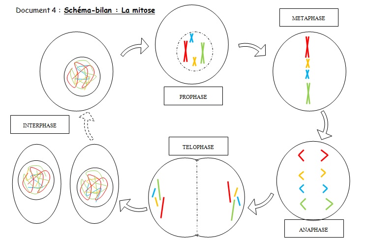 6) Complétez le schéma-bilan de la mitose d’une cellule comportant deux paires de chromosomes (2n = 2).
