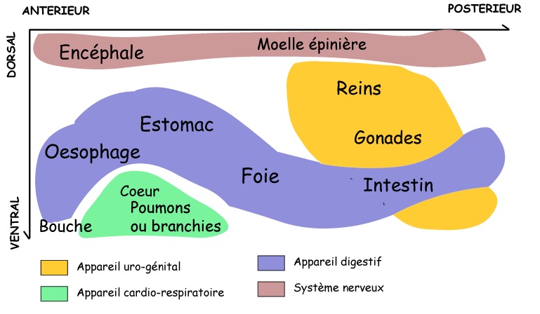 - les principaux organes sont identifiés (cœur, foie, poumons, tube digestif, reins, gonades)