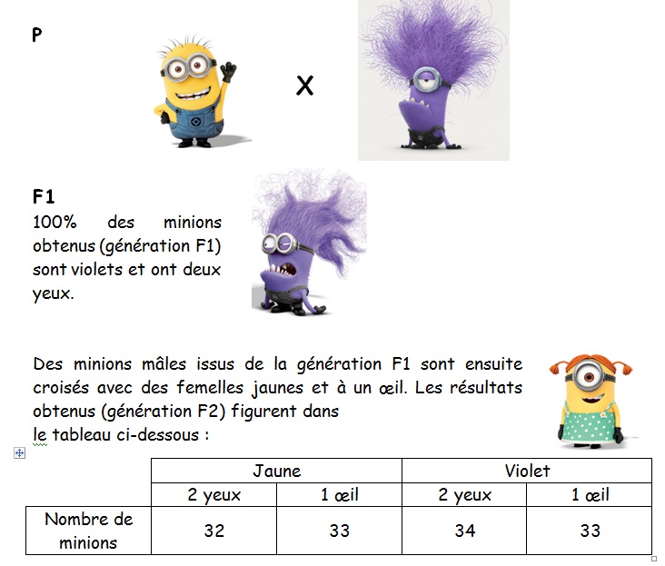 On croise des minions mâles (de lignée pure) jaunes et à deux yeux avec des femelles (de lignée pure) violettes et à un œil.
